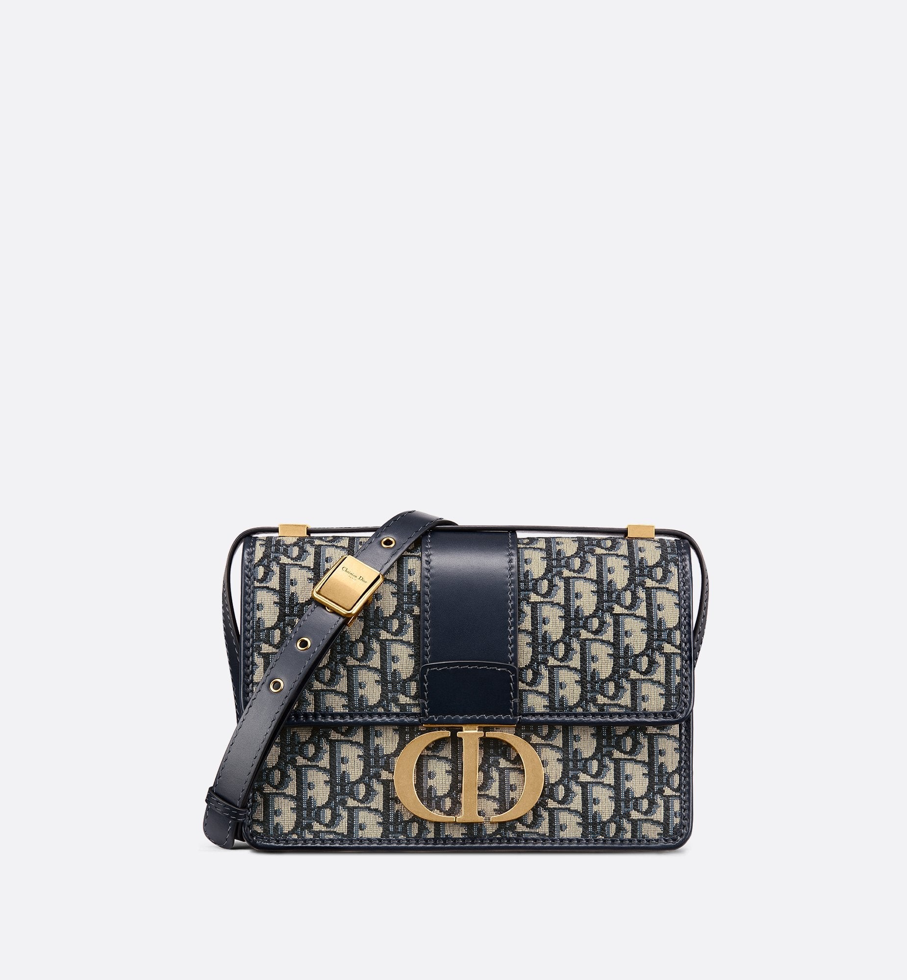 The 30 Montaigne line is inspired by the emblematic address and offers essential pieces that embody the House's iconic codes. The bag is crafted in blue Dior Oblique jacquard for an elegant and timeless look. The flap is embellished with an antique gold-finish metal CD clasp, inspired by the seal of a Christian Dior perfume bottle. Refined details such as an embossed 30 Montaigne signature on the back, define this unique design. Featuring an adjustable leather strap, the 30 Montaigne bag can be carried by hand, worn over the shoulder or crossbody.