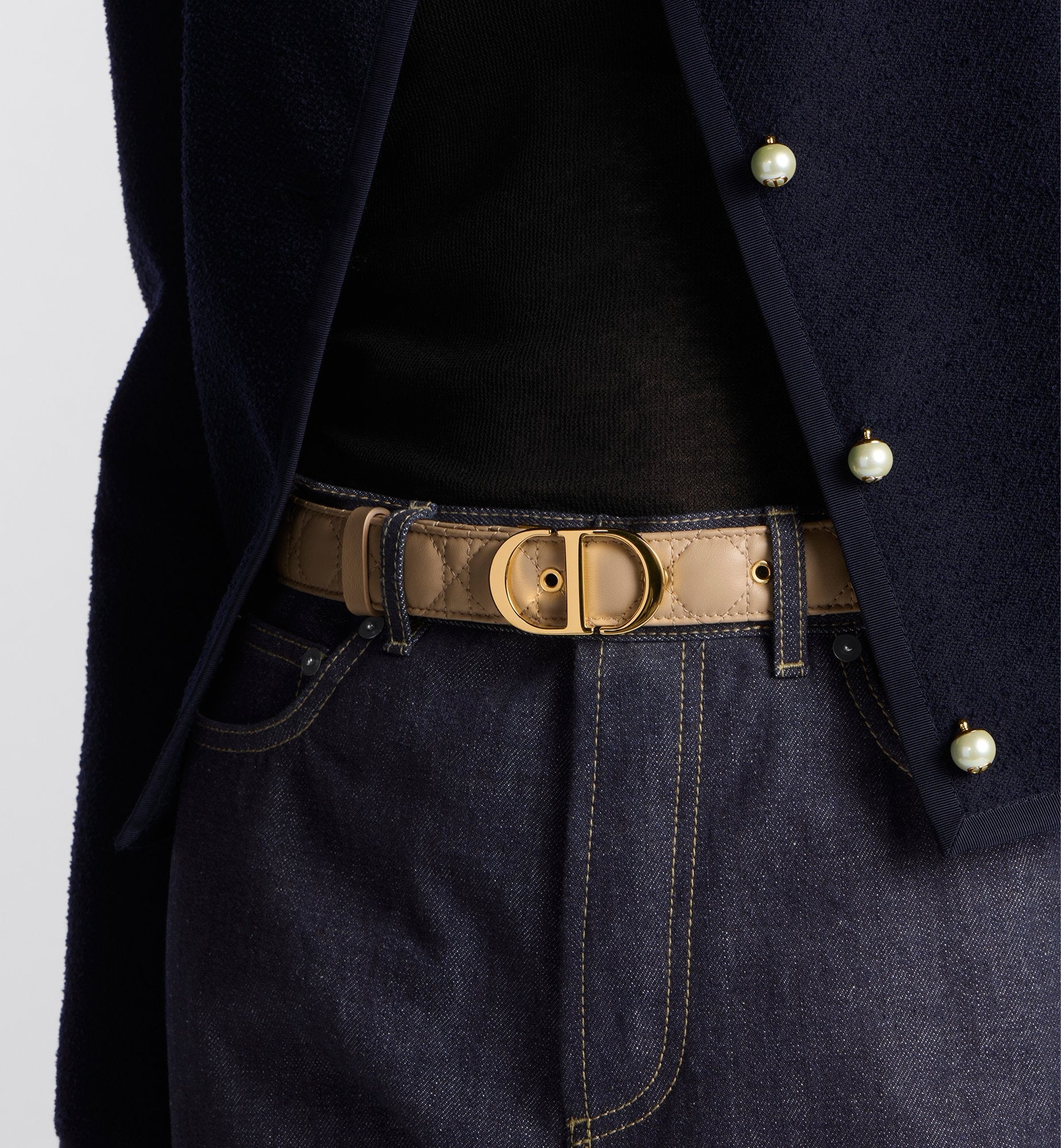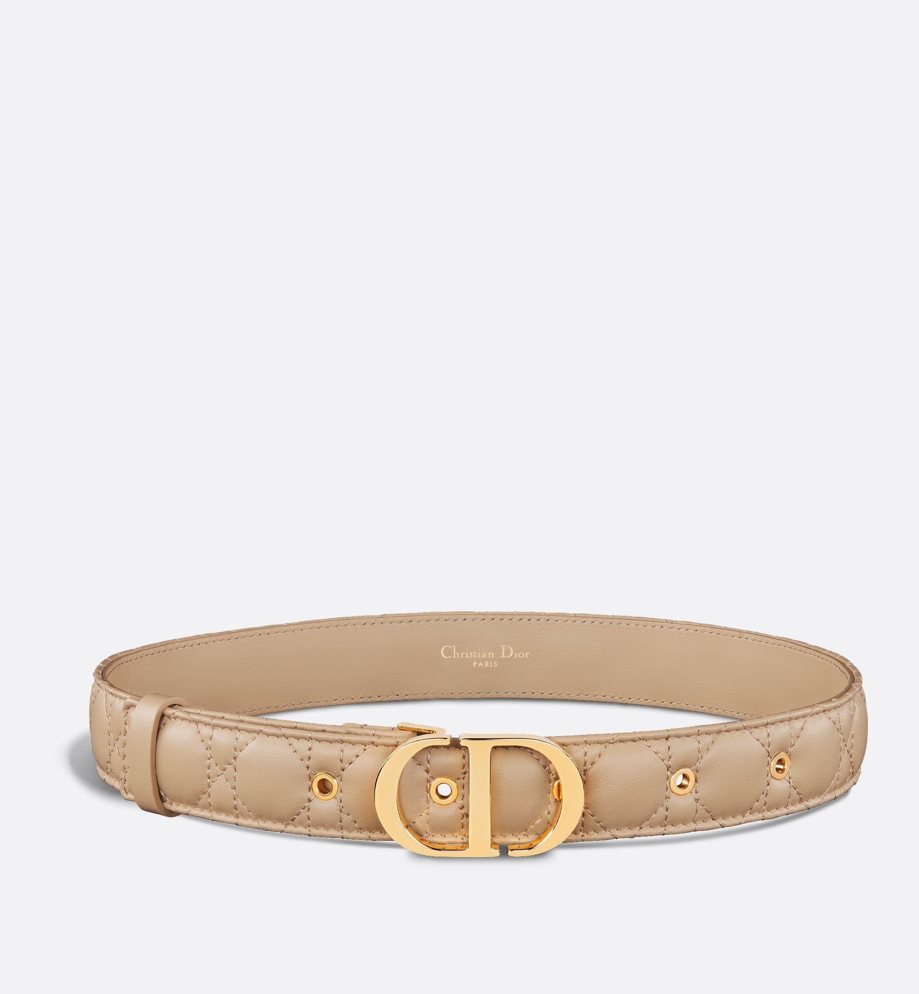 Inspired by the hallmark namesake bag, the 30 Montaigne belt is offered in a new variation that is timeless and elegant, showcasing House codes. Crafted in biscuit smooth calfskin, it stands out with the originality and quilted effect of its iconic Cannage stitching, attesting to the House's unique savoir-faire. Embellished with an iconic CD buckle in shiny gold-finish metal, the belt will pair well with jeans, a skirt or a dress.