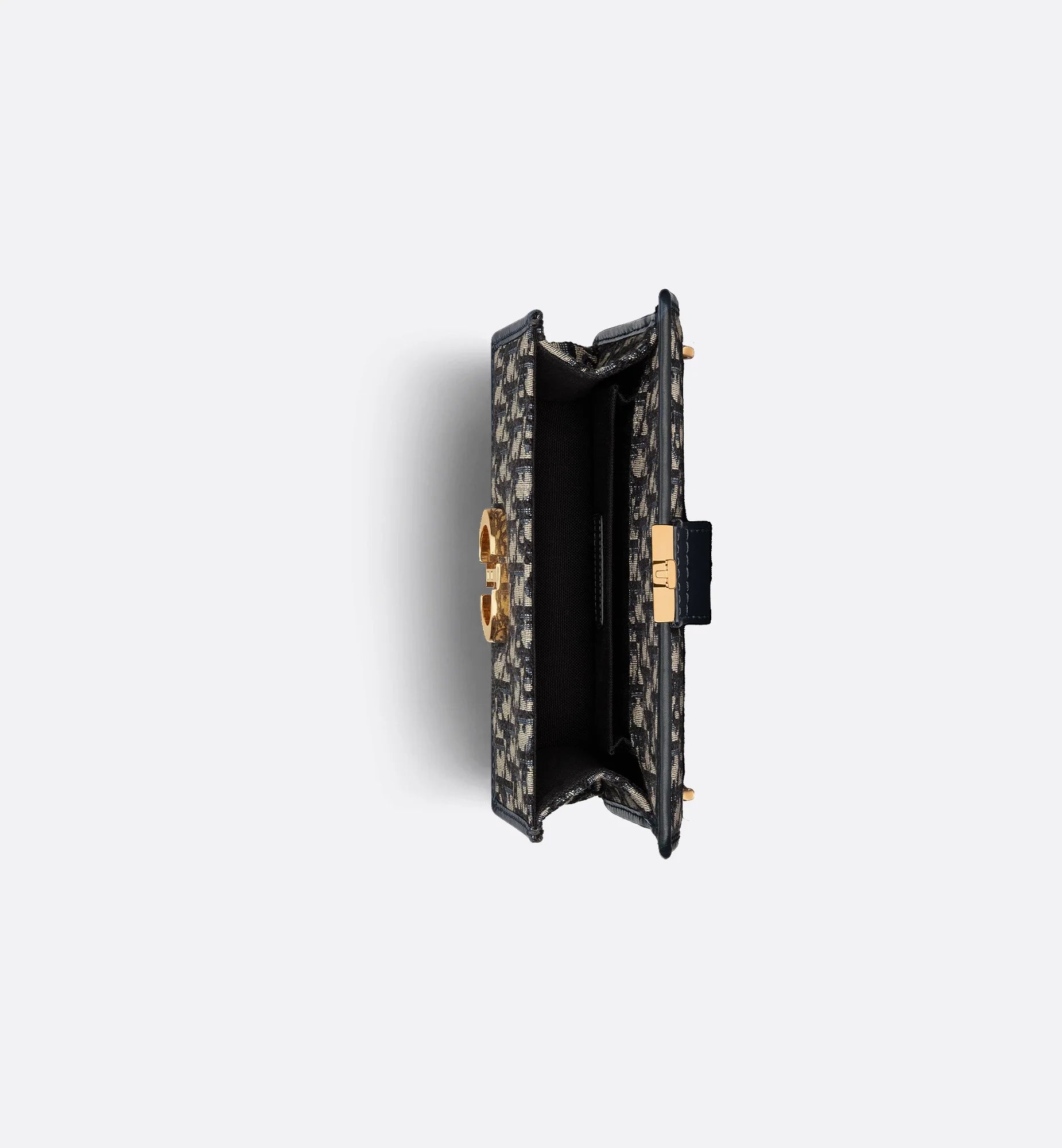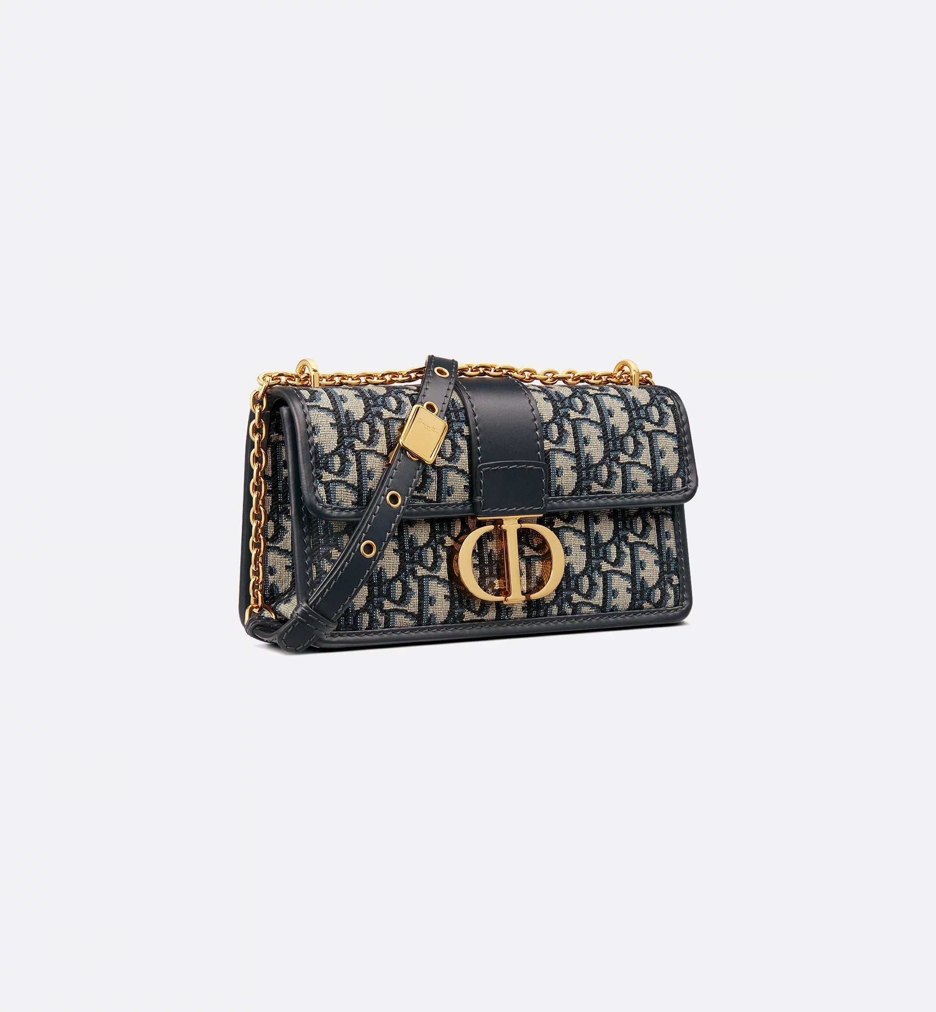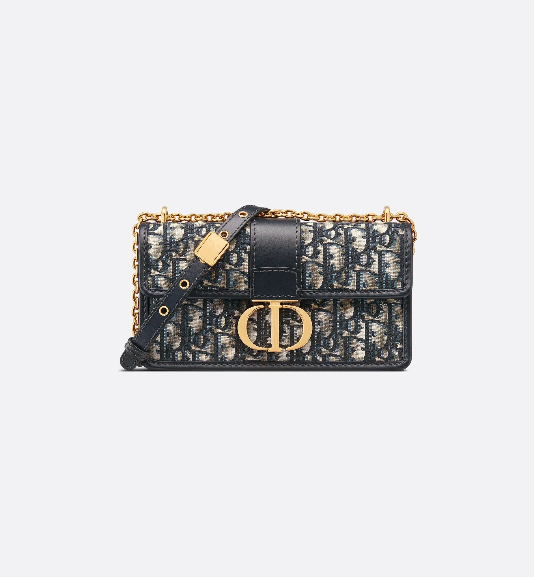 The East-West bag with chain enhances the 30 Montaigne line with a timeless and elegant design. The bag is crafted in blue jacquard and highlights the House's hallmark Dior Oblique motif. The flap has an antique gold-finish metal CD clasp, inspired by the seal of a Christian Dior perfume bottle. Other details, like the embossed 30 Montaigne signature on the back, highlight the streamlined design. The bag features a removable chain strap with a leather insert that allows it to be comfortably carried by hand, worn over the shoulder or crossbody.