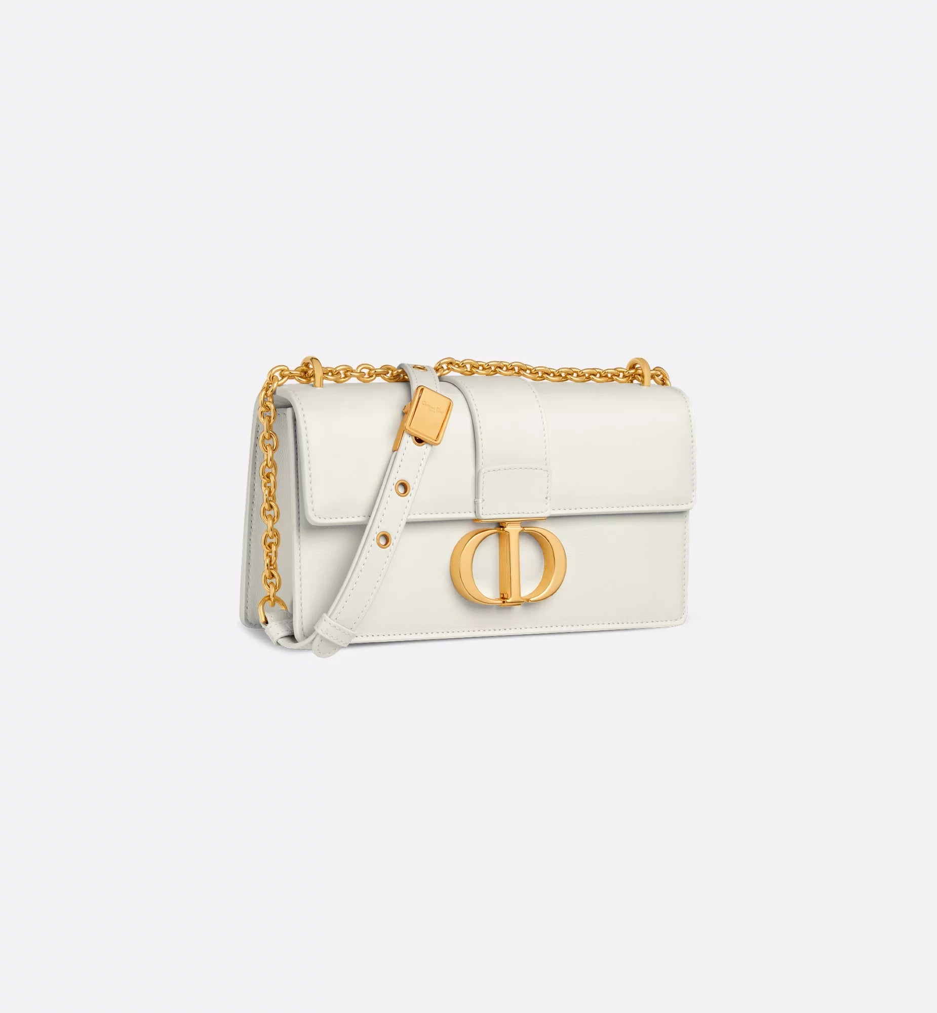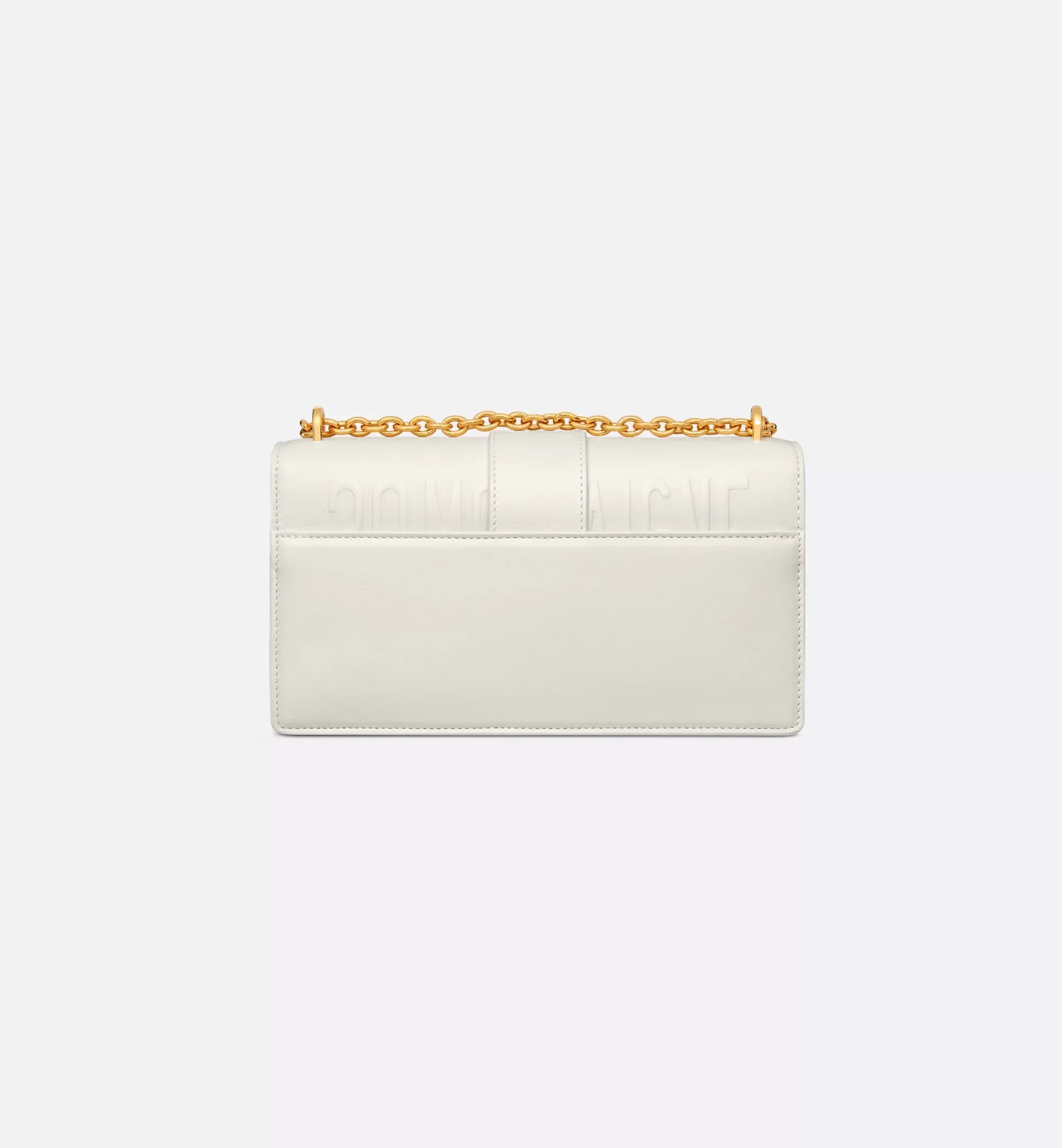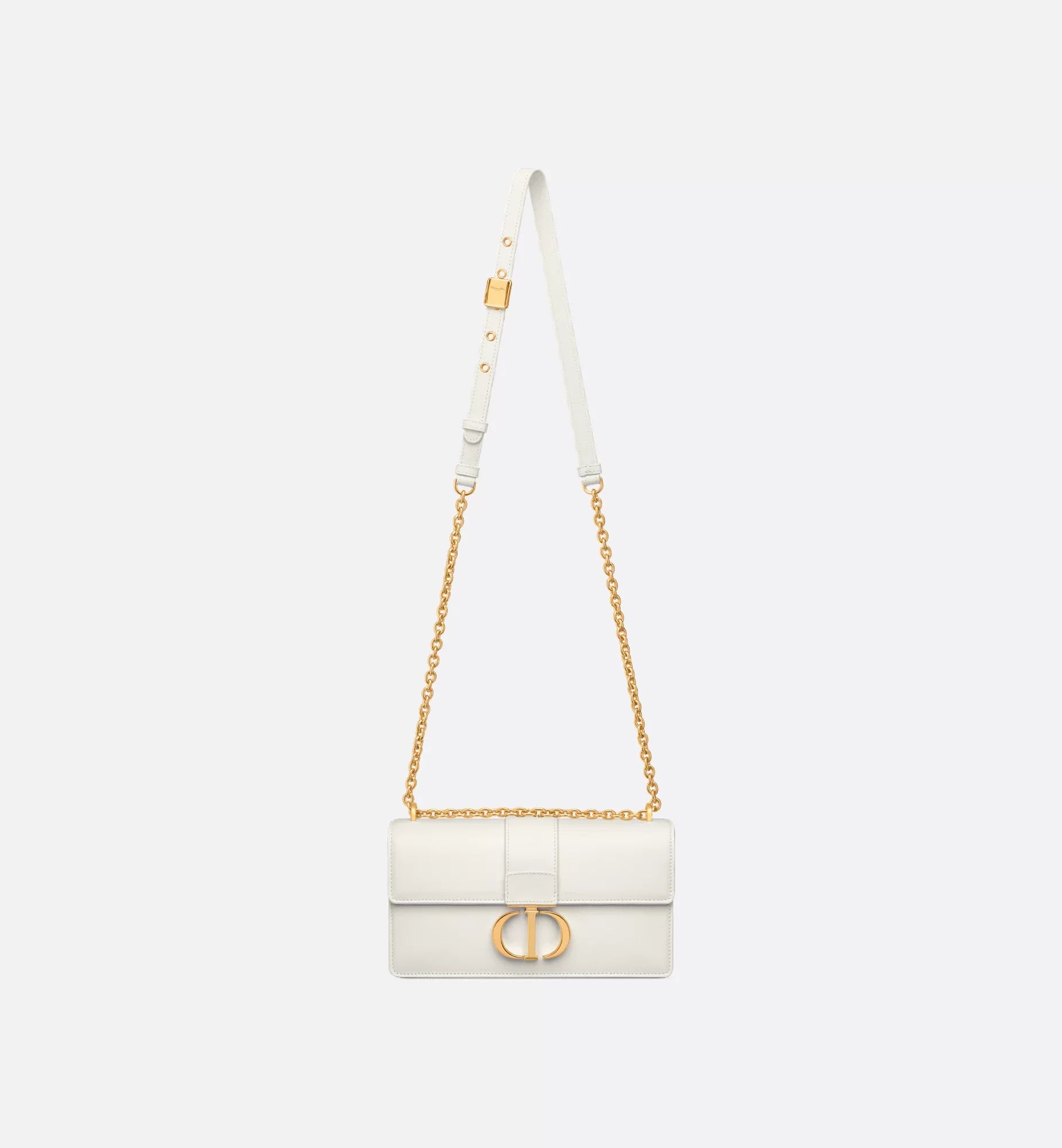The East-West bag with chain enhances the 30 Montaigne line with a timeless and elegant design crafted in latte calfskin. The flap has an antique gold-finish metal CD clasp, inspired by the seal of a Christian Dior perfume bottle. Other details, like the embossed 30 Montaigne signature on the back, highlight the streamlined design. The bag features a removable chain strap with a leather insert that allows it to be comfortably carried by hand, worn over the shoulder or crossbody.