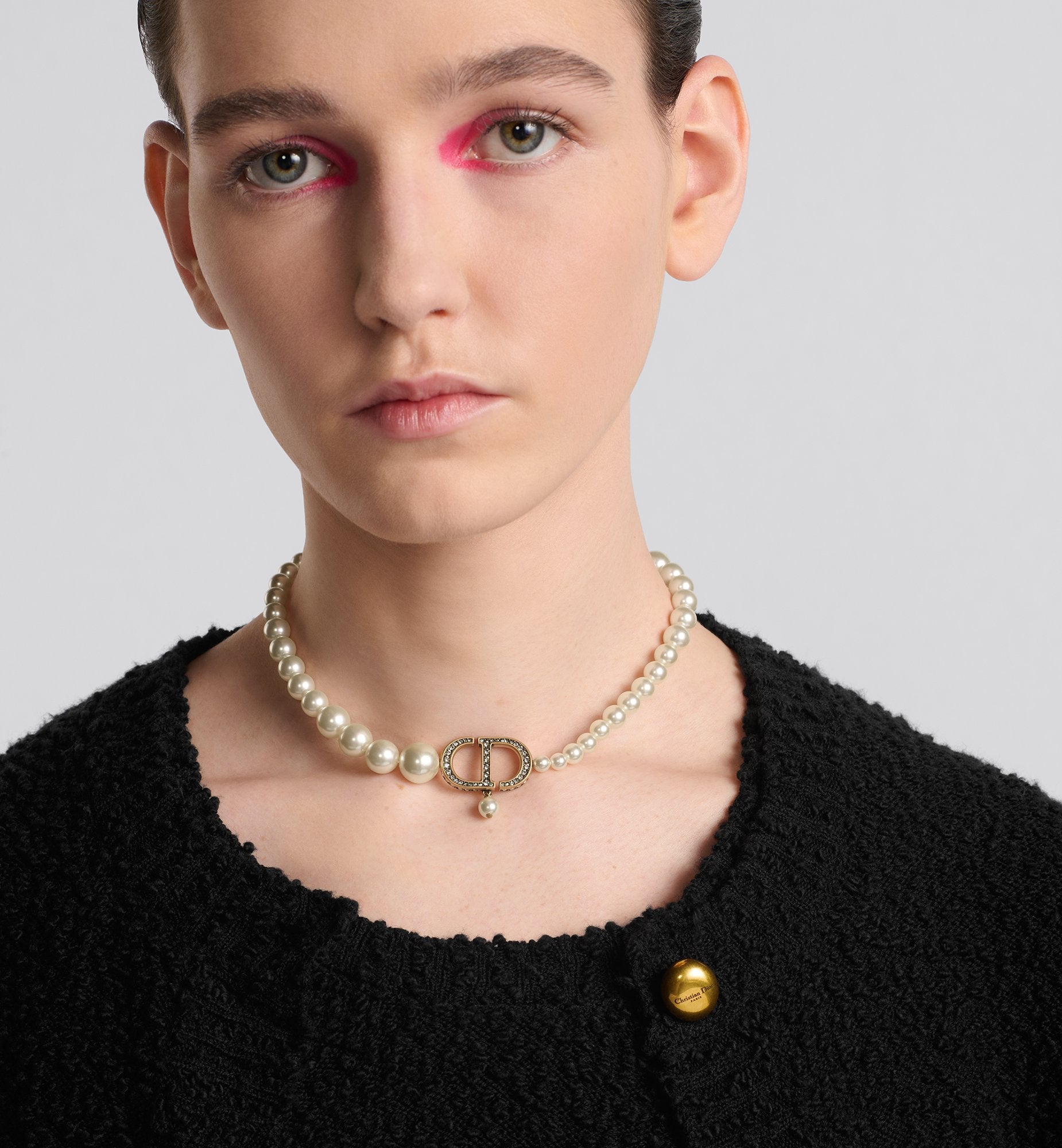 The 30 Montaigne necklace offers elegant and modern appeal. Composed of a row of white resin pearls in an asymmetric gradient, it features the antique gold-finish metal CD signature with pavé-set silver-tone crystals. The delicate and refined necklace can be combined with other creations from the 30 Montaigne line to complete the look.