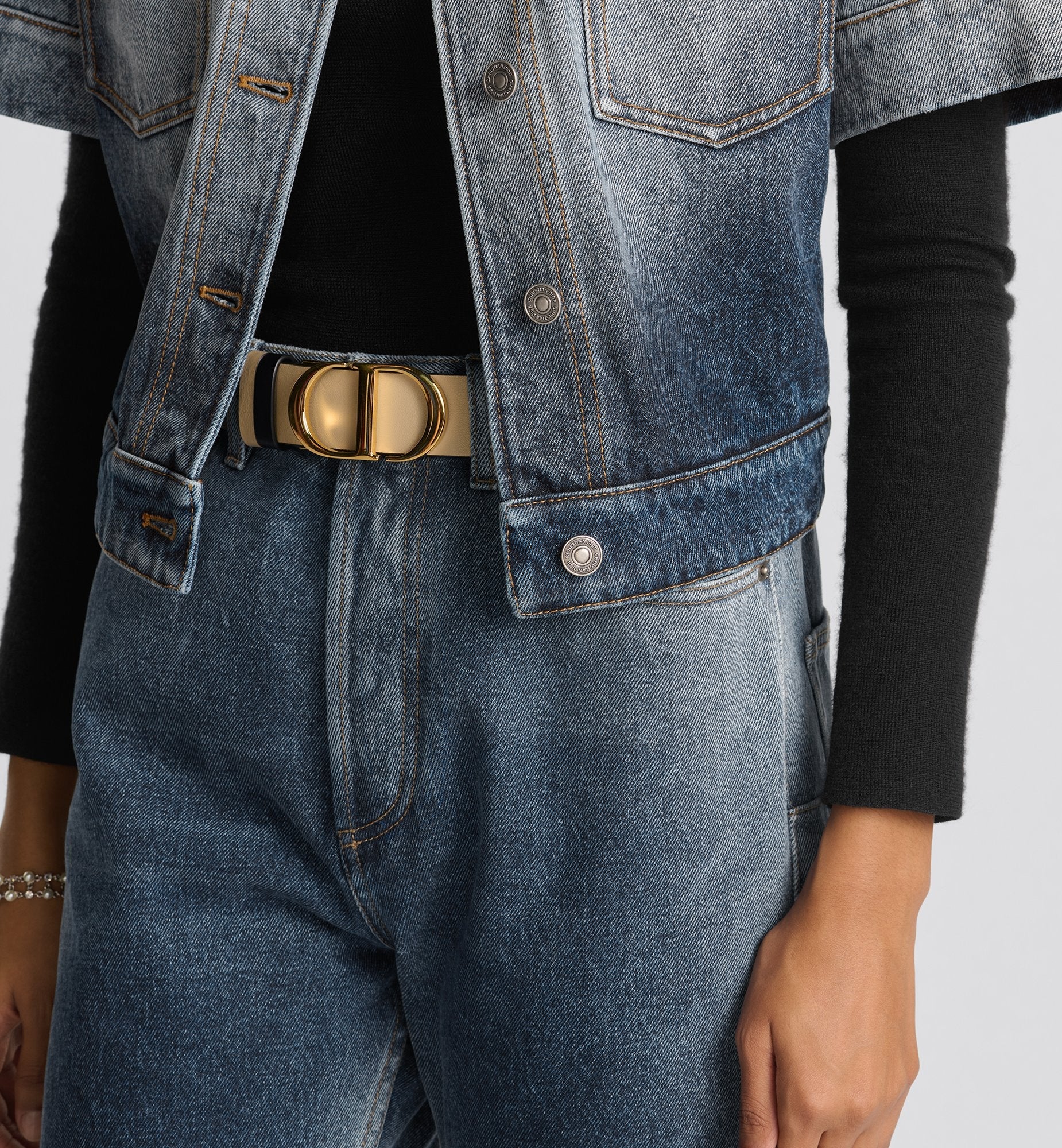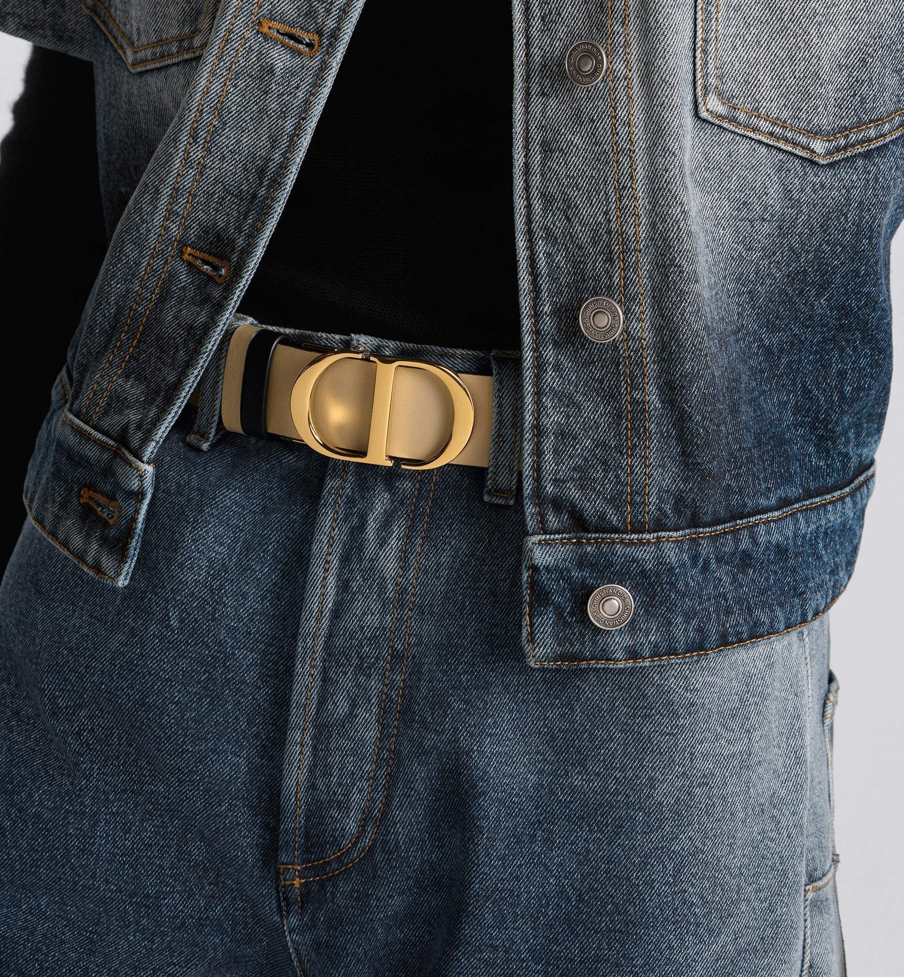 Inspired by the hallmark namesake bag, the 30 Montaigne belt is offered in a reversible variation, thanks to its swivel mechanism. Crafted in black smooth calfskin on one side and rope beige smooth calfskin on the other, it is embellished with the iconic CD buckle in shiny gold-finish metal. The design also features two removable loops that can be worn in a tonal or contrasting fashion. The timeless accessory elegantly highlights the waist and will coordinate well with a skirt or dress.