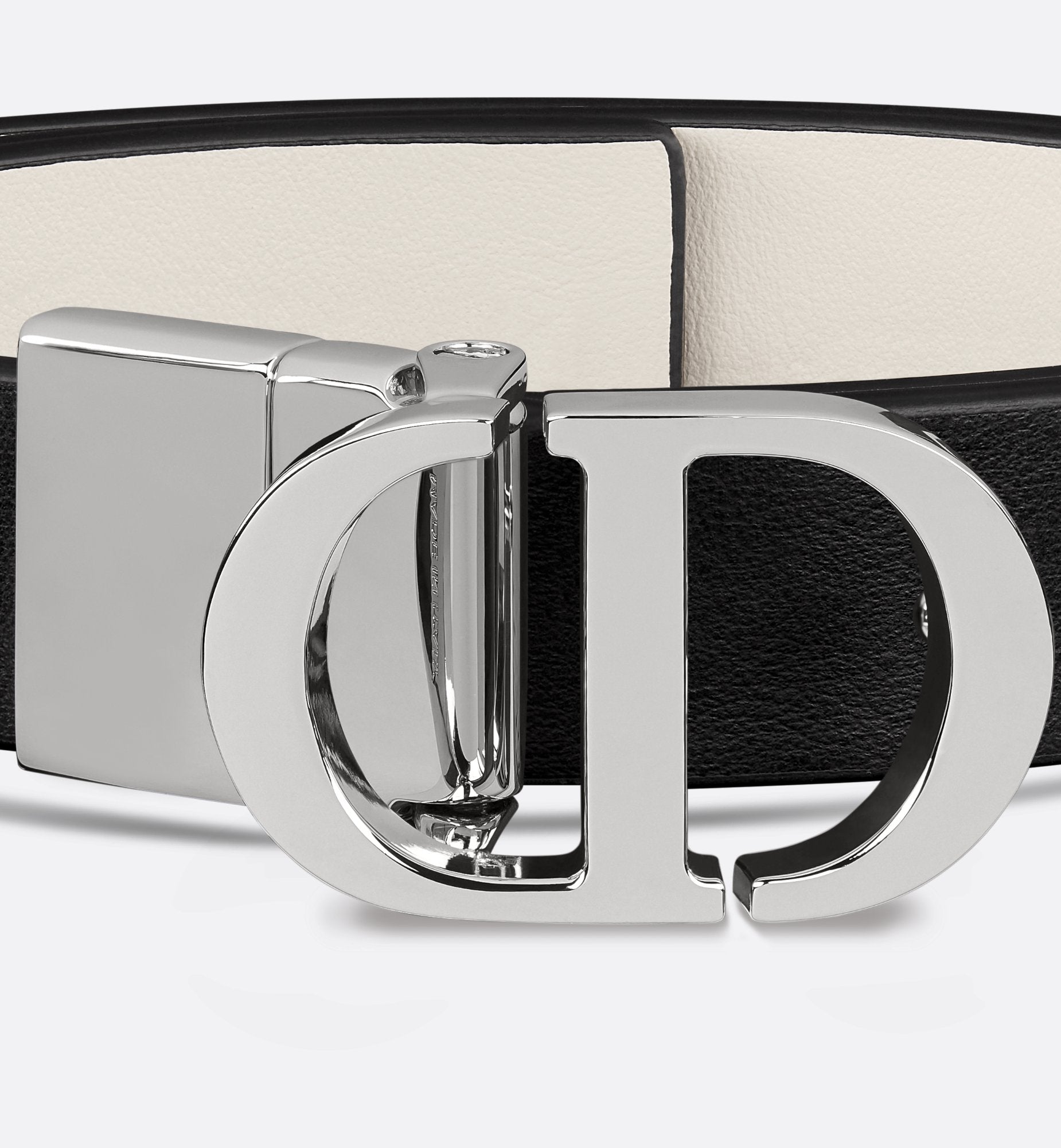 Inspired by the hallmark namesake bag, the 30 Montaigne belt is offered in a reversible variation, thanks to its swivel mechanism. Crafted in black smooth calfskin on one side and white smooth calfskin on the other, it is embellished with the iconic CD buckle in a palladium-finish metal version. The design also features two removable loops that can be worn in a tonal or contrasting fashion. The timeless accessory elegantly highlights the waist and will coordinate well with jeans, a skirt or a dress.
