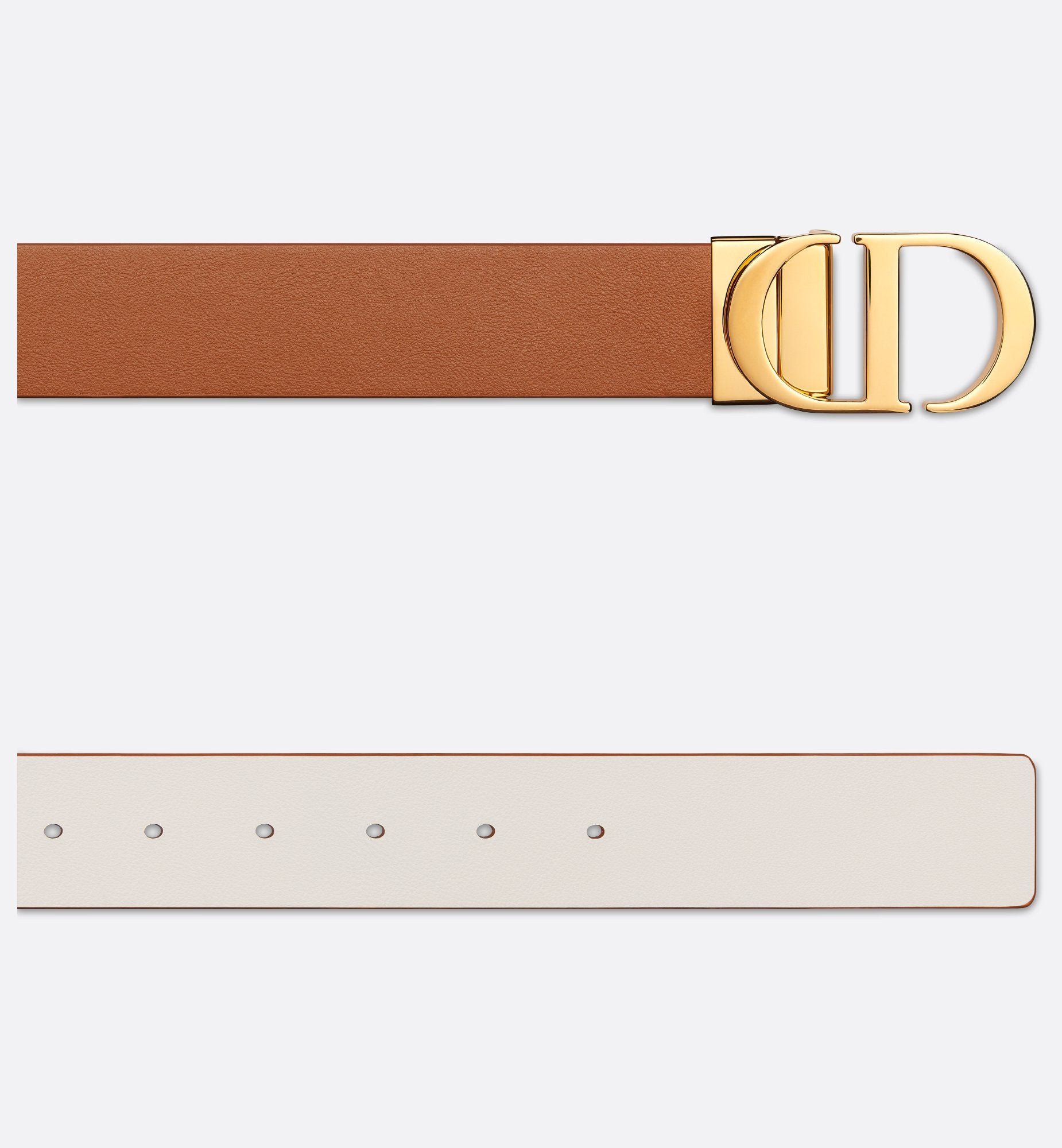 Inspired by the hallmark namesake bag, the 30 Montaigne belt is offered in a reversible variation, thanks to its swivel mechanism. Crafted in golden saddle smooth calfskin on one side and latte smooth calfskin on the other, it is embellished with the iconic CD buckle in shiny gold-finish metal. The design also features two removable loops that can be worn in a tonal or contrasting fashion. The timeless accessory elegantly highlights the waist and will coordinate well with a skirt or dress.
