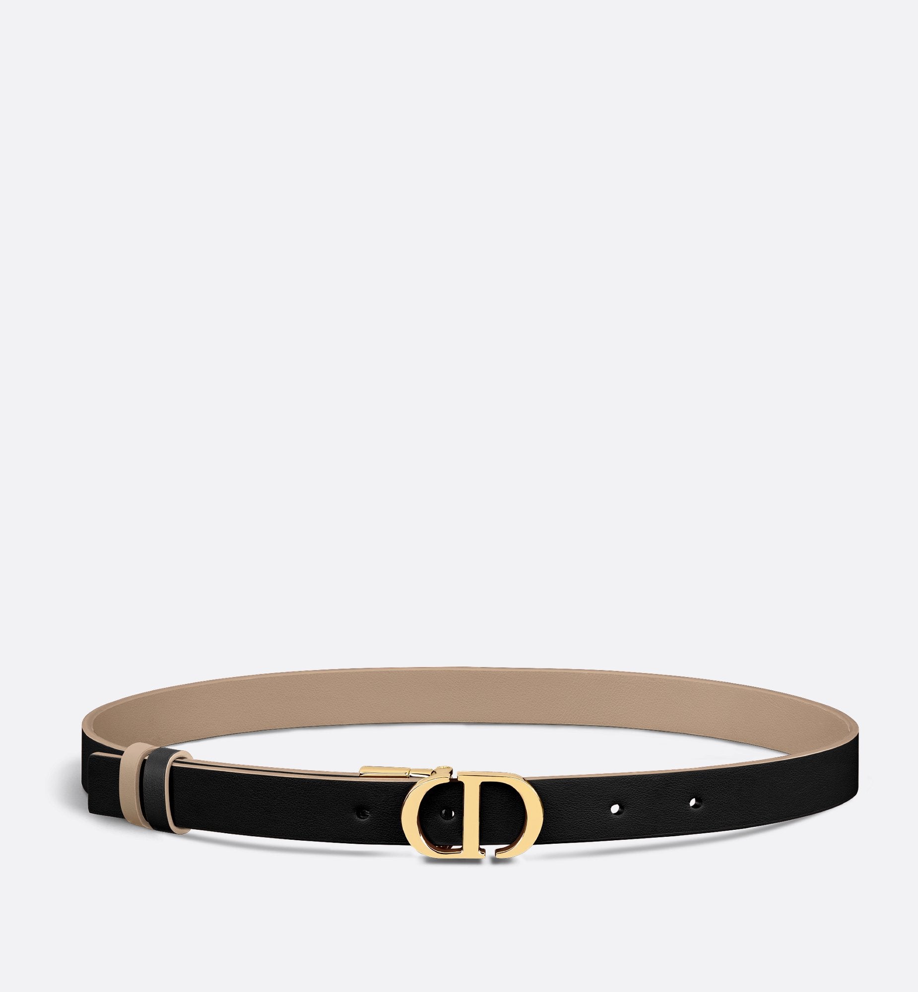Inspired by the hallmark namesake bag, the 30 Montaigne belt is offered in a reversible variation, thanks to its swivel mechanism. Crafted in hazelnut smooth calfskin on one side and black smooth calfskin on the other, it is embellished with the iconic CD buckle in shiny gold-finish metal. The design also features two removable loops that can be worn in a tonal or contrasting fashion. The timeless accessory elegantly highlights the waist and will coordinate well with jeans, a skirt or a dress.