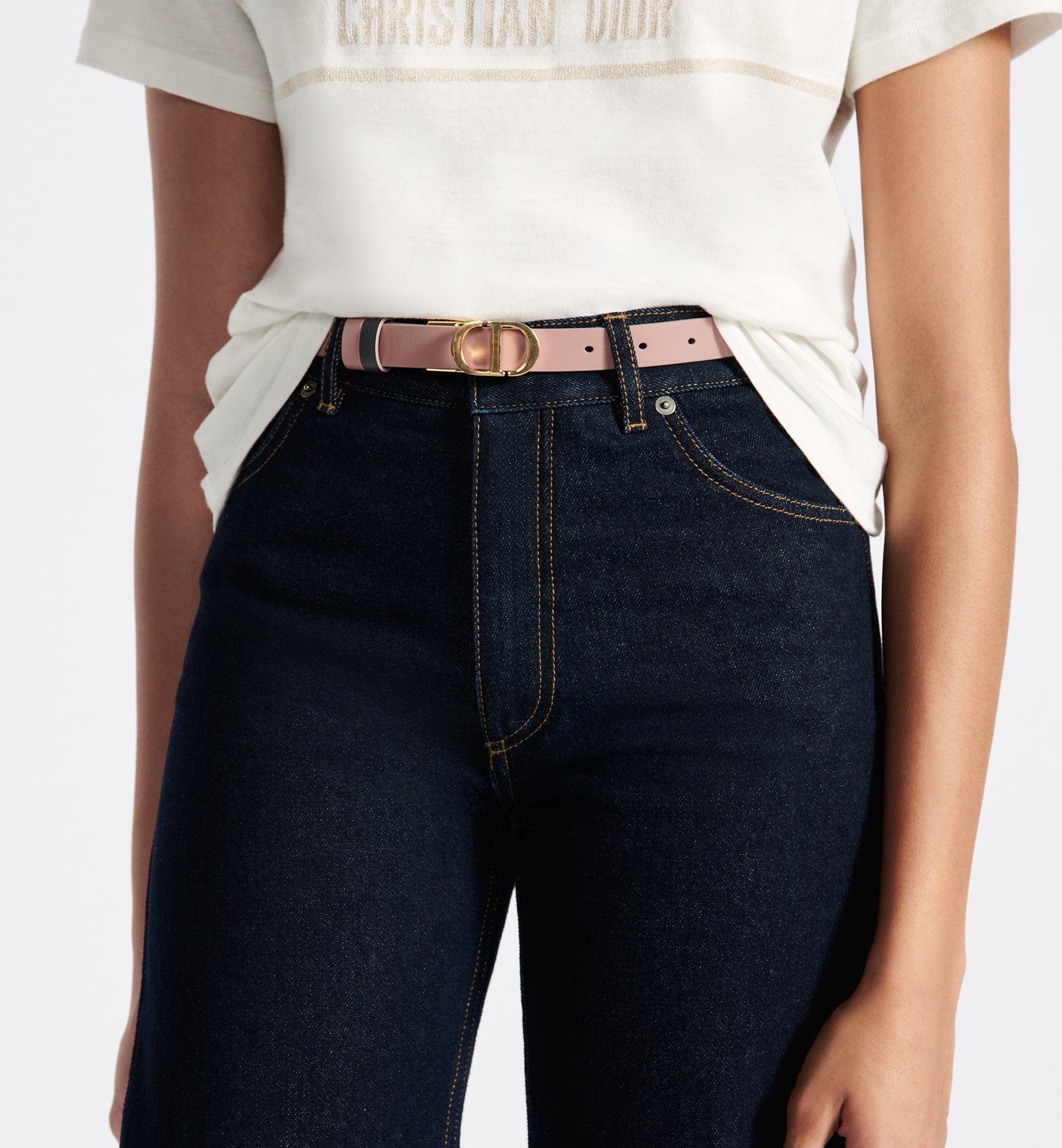 Inspired by the hallmark namesake bag, the 30 Montaigne belt is offered in a reversible variation, thanks to its swivel feature. Crafted in powder pink smooth calfskin on one side and black on the other, it is embellished with the iconic shiny gold-finish metal CD buckle. The design also features two removable loops that can be worn in an either tonal or contrasting fashion. The timeless accessory elegantly highlights the waist and will pair effortlessly with jeans, a skirt or a dress.