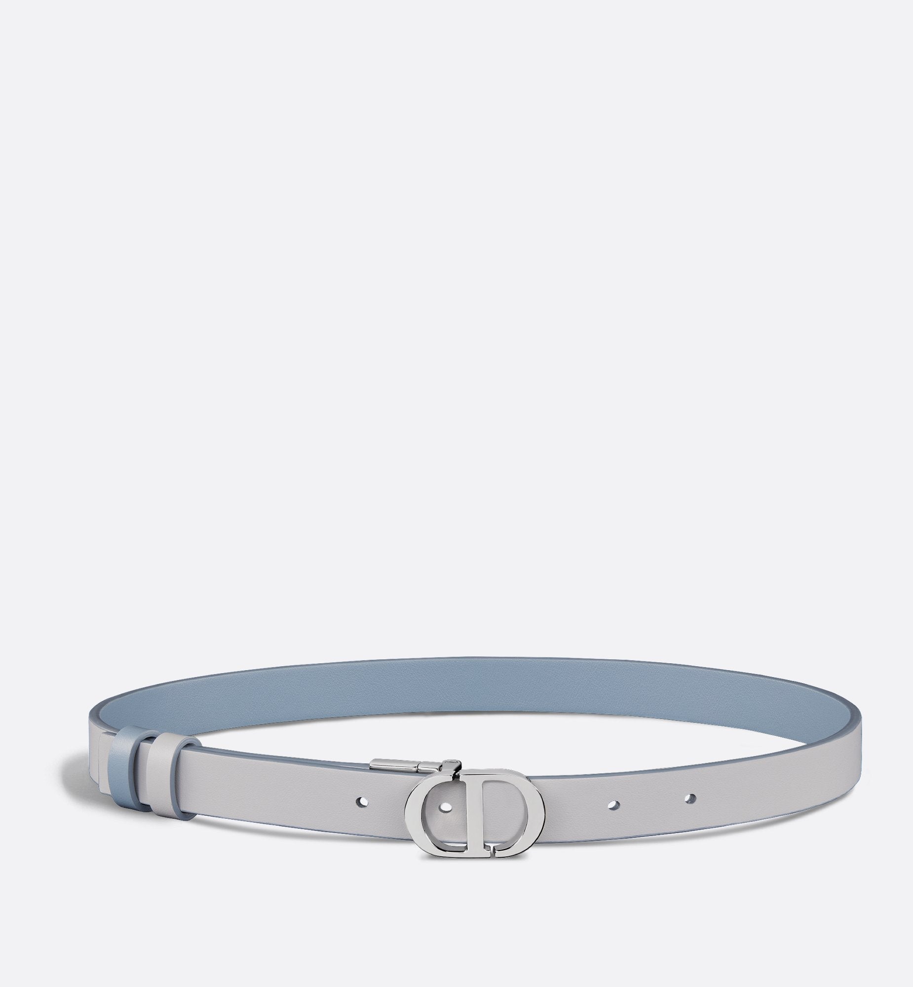 Inspired by the hallmark namesake bag, the 30 Montaigne belt is offered in a reversible variation, thanks to its swivel mechanism. Crafted in slate blue smooth calfskin on one side and gray smooth calfskin on the other, it is embellished with the iconic CD buckle in a palladium-finish metal version. The design also features two removable loops that can be worn in a tonal or contrasting fashion. The timeless accessory elegantly highlights the waist and will coordinate well with jeans, a skirt or a dress.