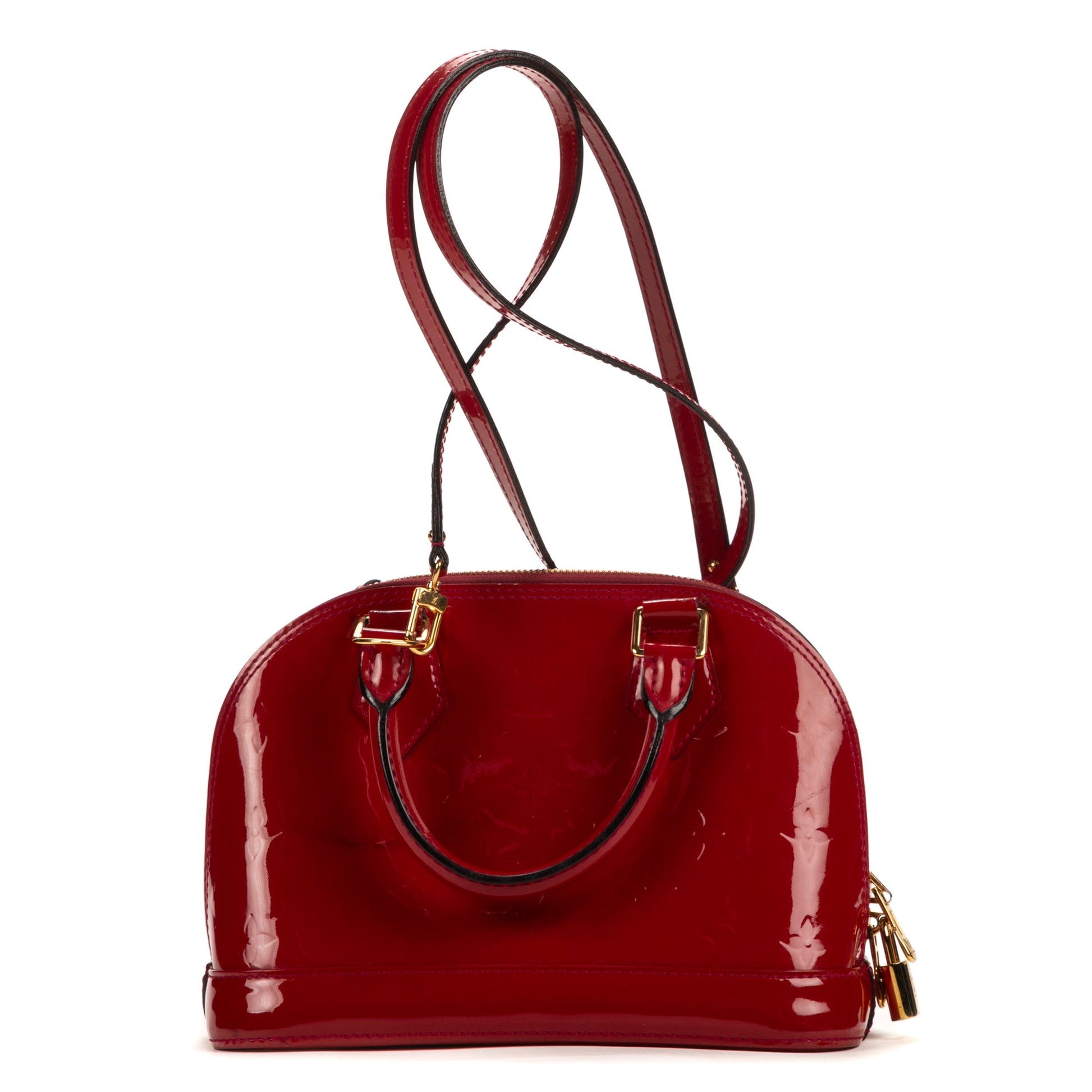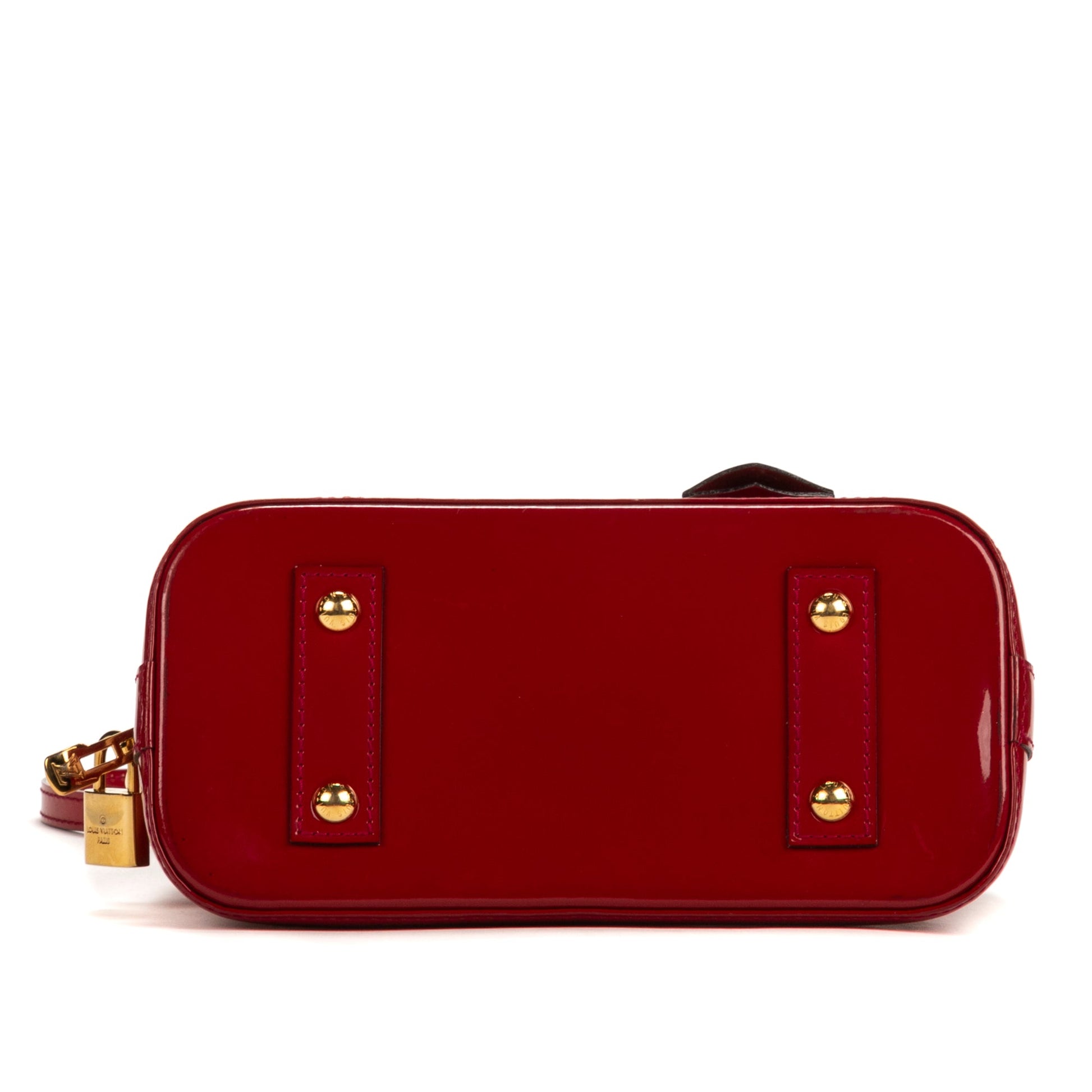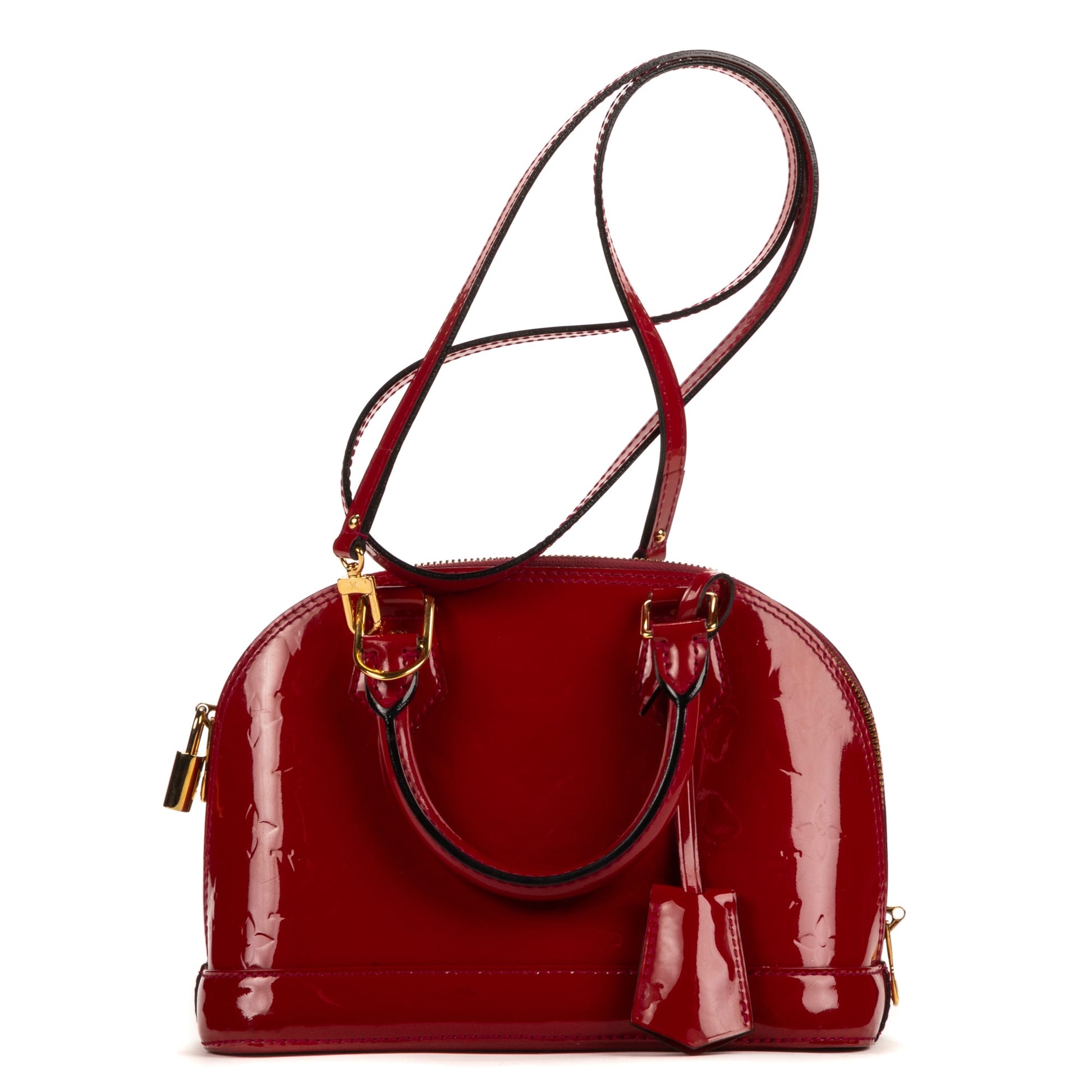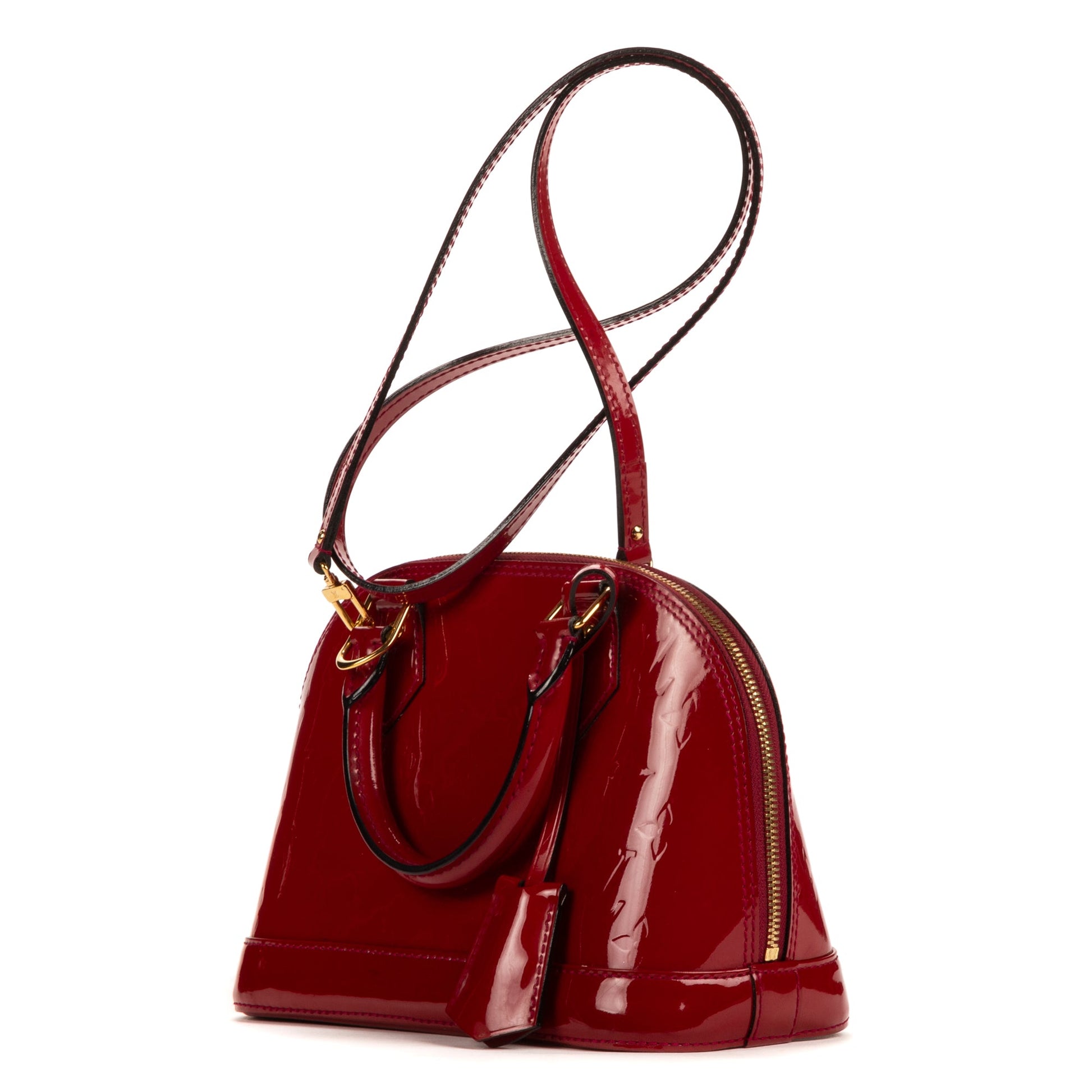 Louis Vuitton Handbag in Red Monogram Vernis and Golden Brass hardware. Dimensions - 24*17*10cm. Serial number - MI3173. Inclusions - Strap, Cadenas, Key in clochette.