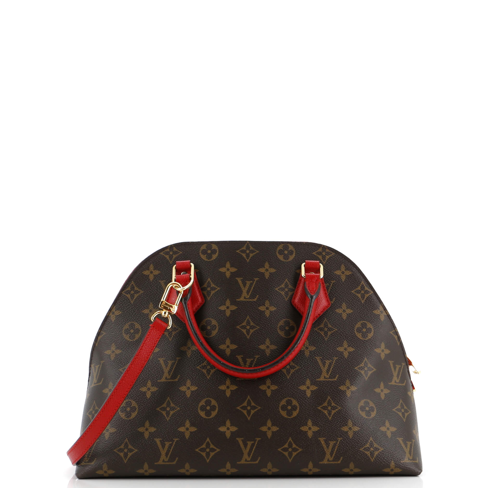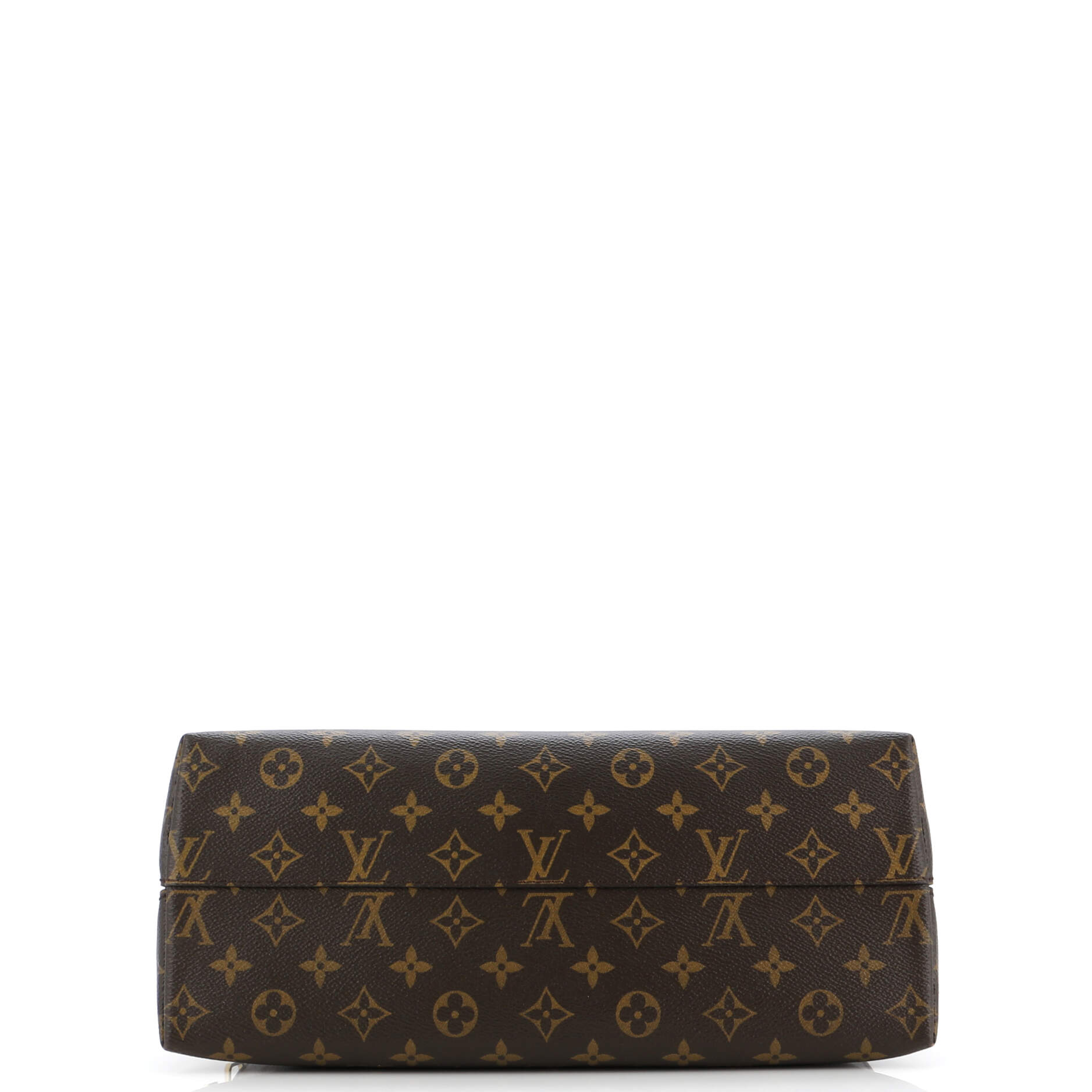Condition - Good. Odor in interior. Creasing on exterior, moderate wear and peeling on base corners, minor wear on handles and strap. Darkening on handle stitching, peeling on opening wax edges, indentations on handle wax edges. Wear and marks in interior, scratches and tarnish on hardware.