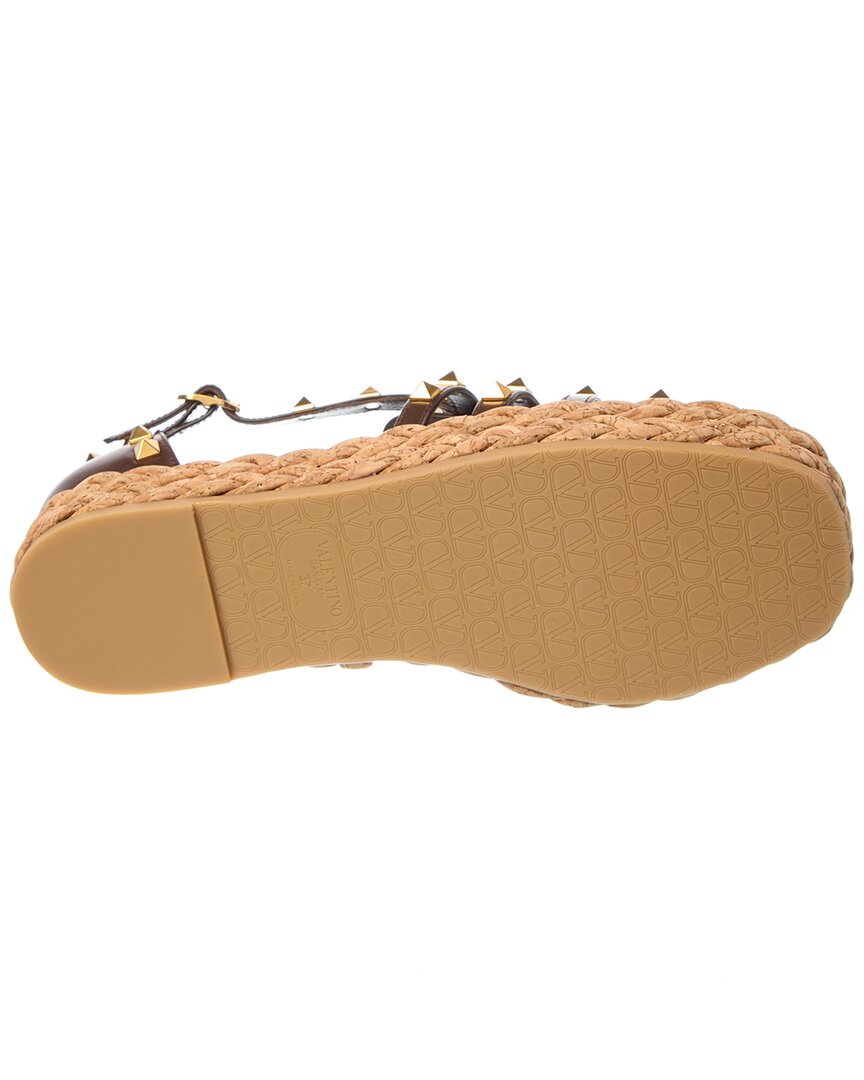 - Rockstud 30 Leather Platform Sandal In Brown Leather And Gold-Tone Hardware With Rockstud Embellishments And Braided Cork Platform