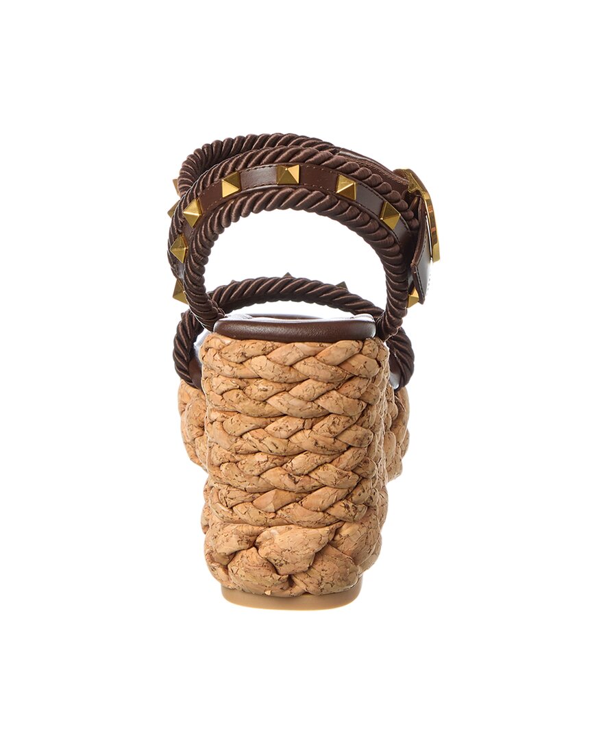 - Rockstud 100 Leather Wedge Sandal In Brown Leather And Braided Rope And Gold-Tone Hardware With Rockstuds And Braided Cork Wedge