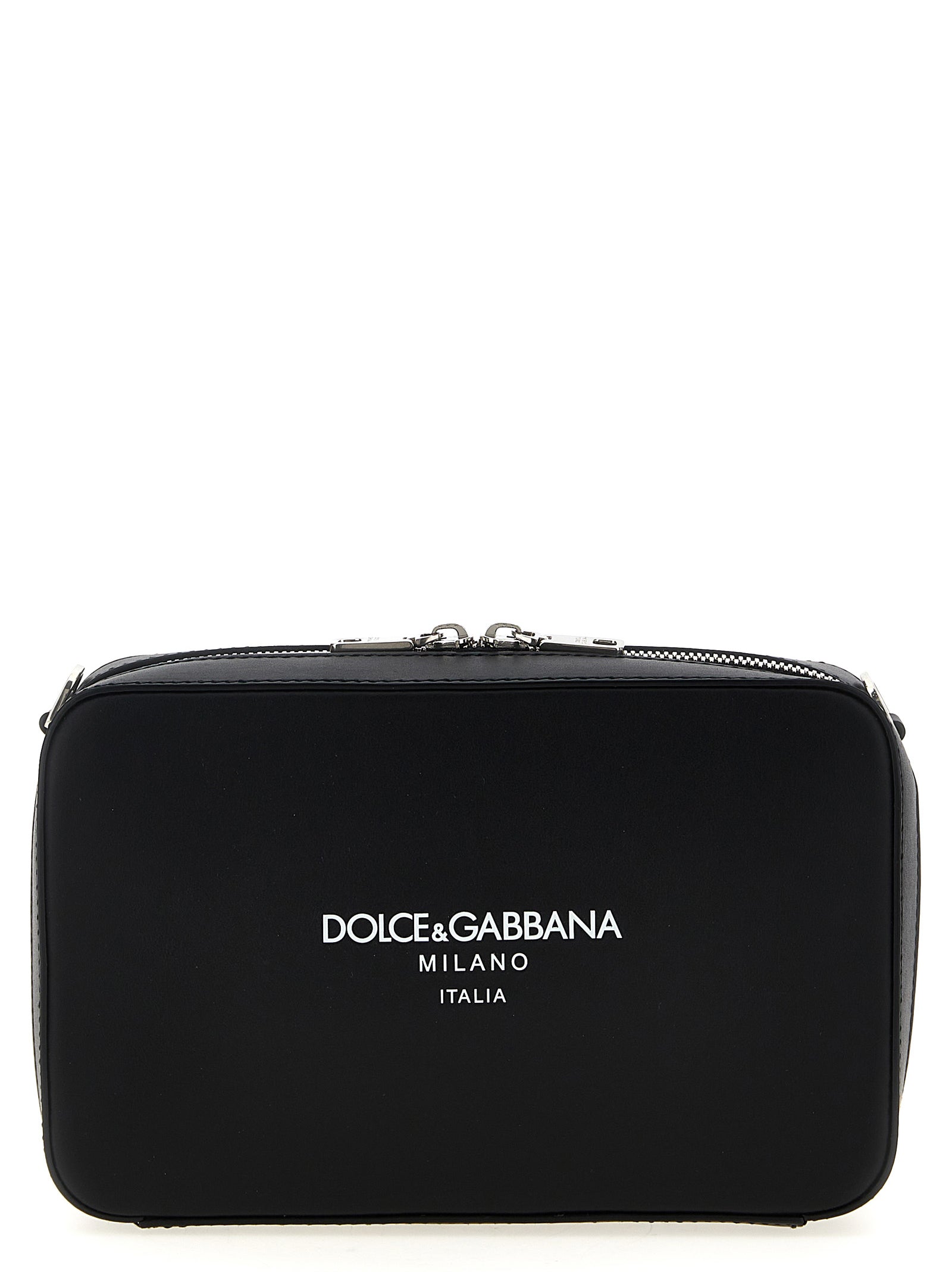 Leather shoulder strap with embossed logo on the front, zip closure, back pocket, adjustable and removable shoulder strap.