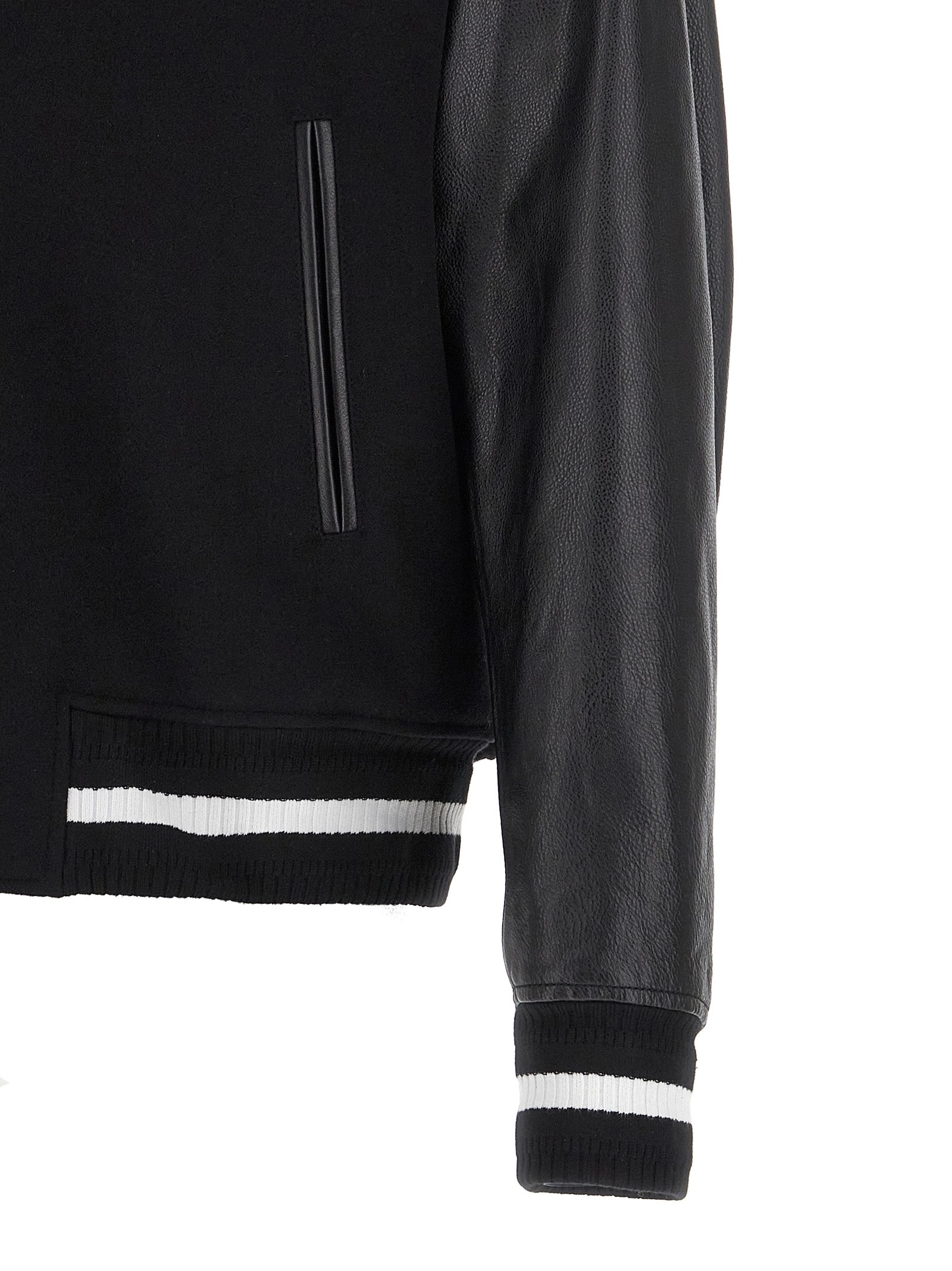 Varsity' wool bomber jacket with leather sleeves, front logo patch, knit edging and cuffs.