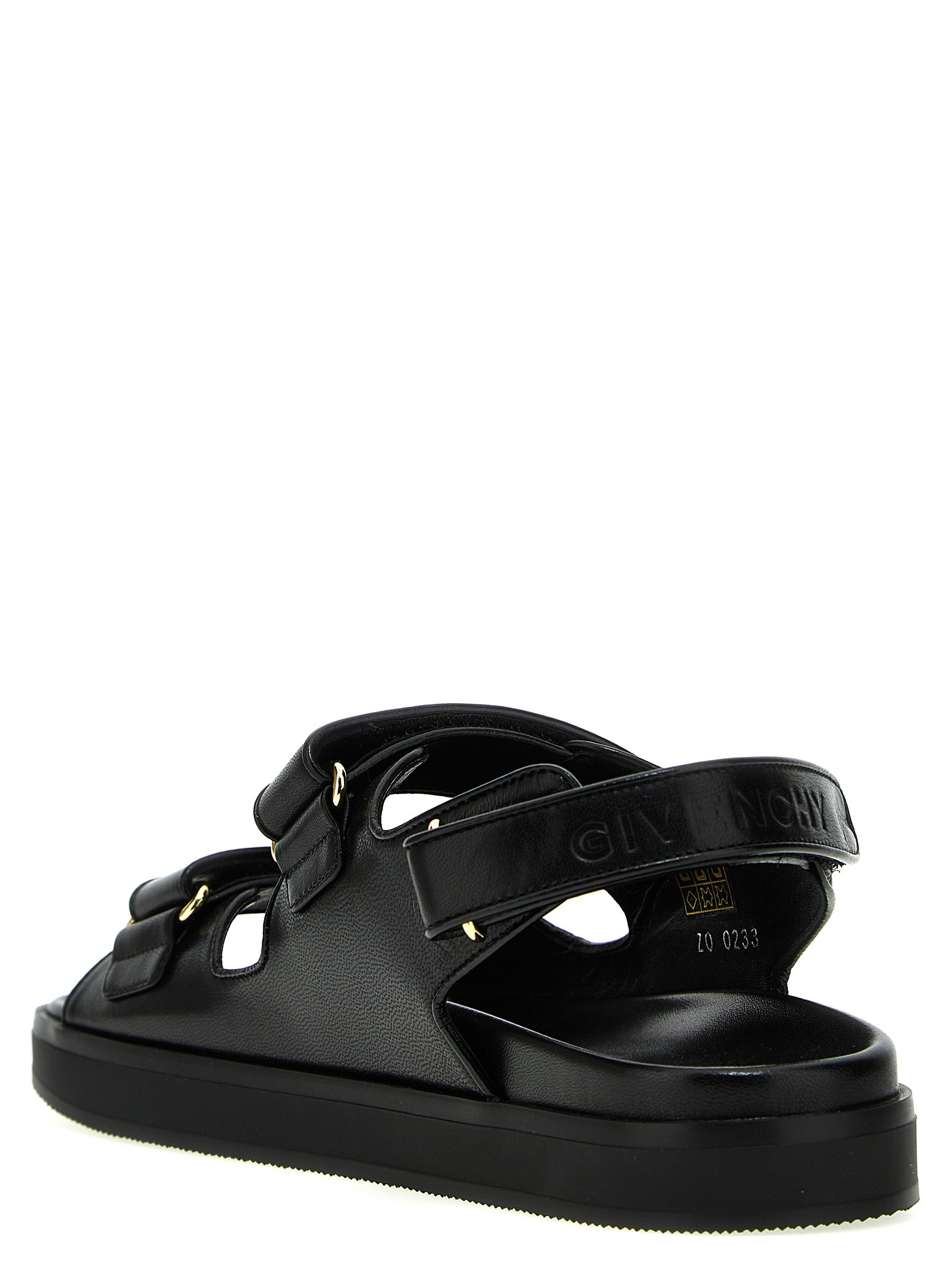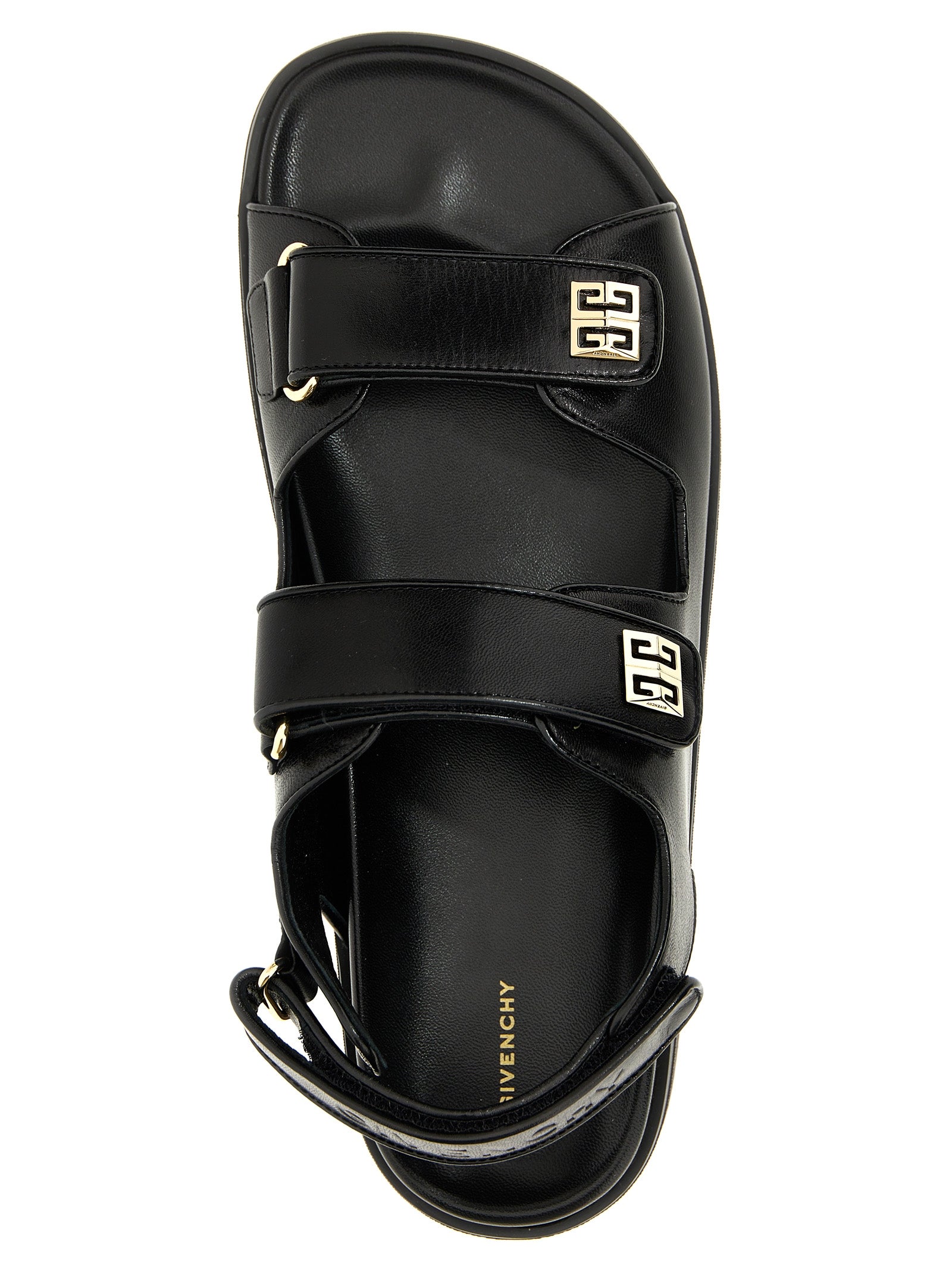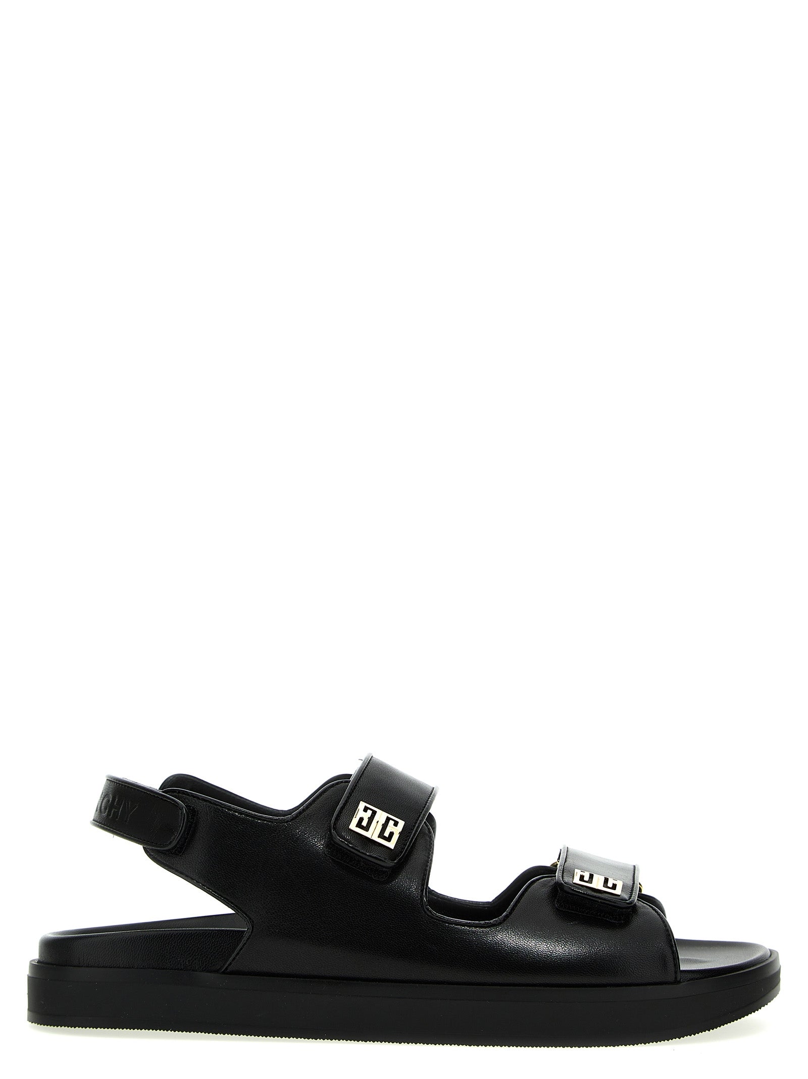 4G' leather sandals with adjustable velcro bands, gold metal logo tag appliqué and a rubber sole.